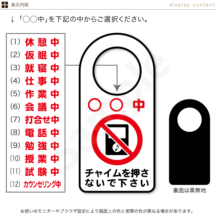 サイズ プレートサイズ:W100mm×H210mm 厚さ1mm 材質 表示面:PVCステッカー、マットラミネート、プレート本体:PVC(ブラック) 特徴 ドアノブに掛けるだけの簡単表示。